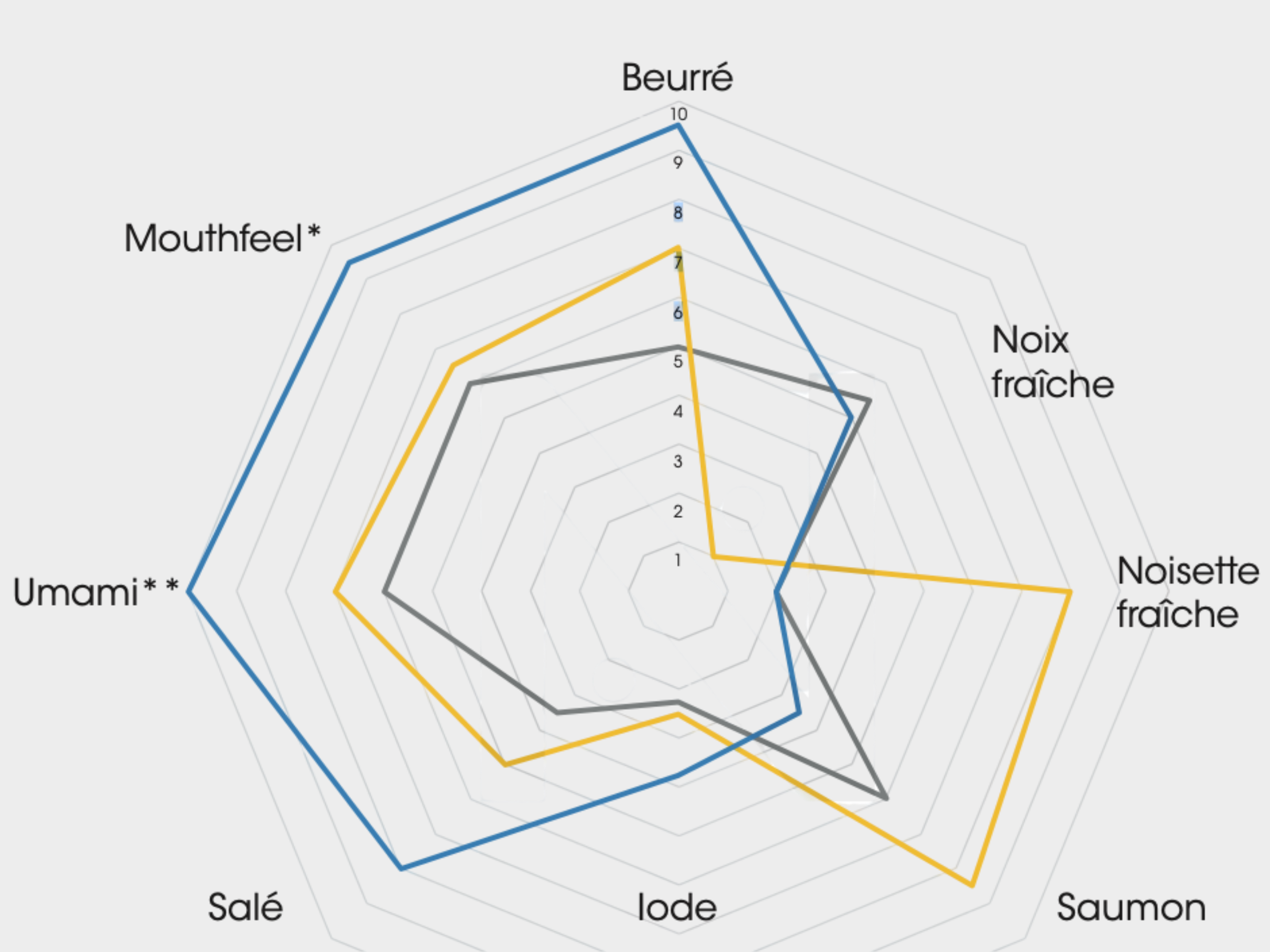 (Le “mouthfeel” désigne la sensation physique en bouche – texture, gras, ampleur. L’“umami”, cinquième saveur, se traduit par une impression savoureuse et profonde.)
